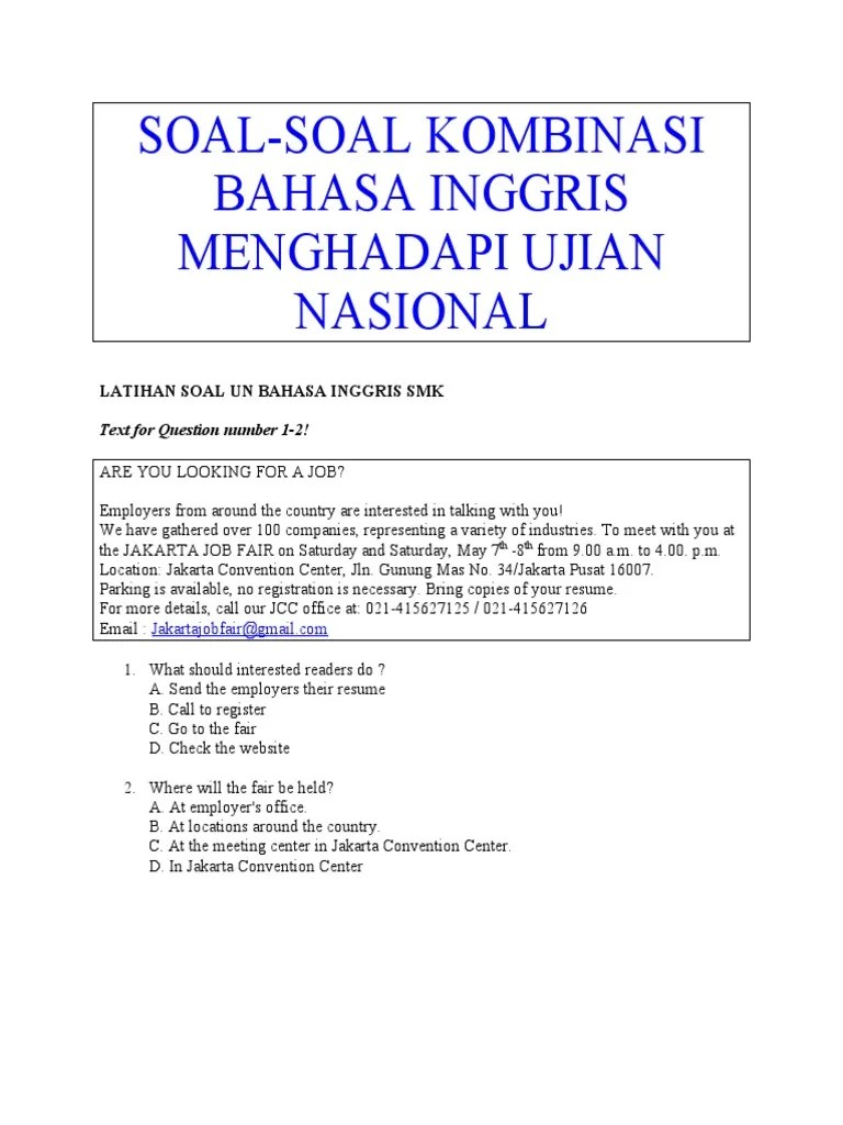 Contoh soal un bahasa inggris smk dan pembahasannya from pdfslide.net. Mengerjakan soal error recognition ujian nasional smk 2015 dalam ujian nasional bahasa inggris, utamanya smk, para siswa akan dihadapkan pada beberapa jenis . Aturan dalam mengerjakan soal error recognition adalah peserta diminta memilih kata atau frase yang. Pembahasan soal ujian inggris smk. Doc latihan soal bahasa inggris kelas xii smk disertai .